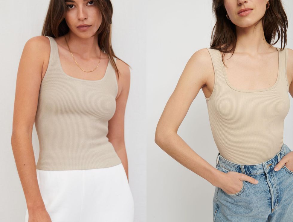 Details: The Babaton Sculpt Knit Tank (left, $68) is a basic that you can find a dupe for on Dynamite's website. The colour options are very similar, too, and you can choose between seven neutral shades.
