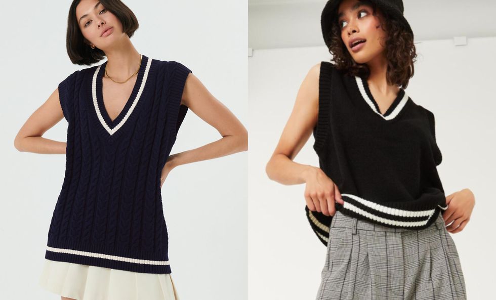 Details: The Sunday Best Winston Sweater Vest (left, $88) is a great fall top that looks good alone or with a blouse underneath. The Ardene version (that's also available in white and beige) doesn't have the same cable-knit texture but still gives off the same vibe.