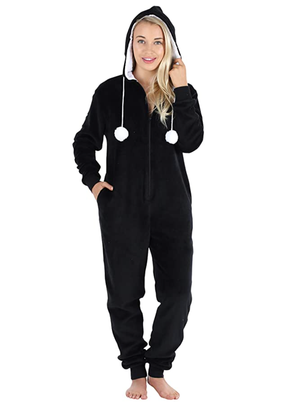 This fleece onesie is a cozier option that's has a sherpa lining and a handy zip closure. The hood is great for keeping your noggin warm, too. It's available in sizes XS to XXL plus and seven patterns.
