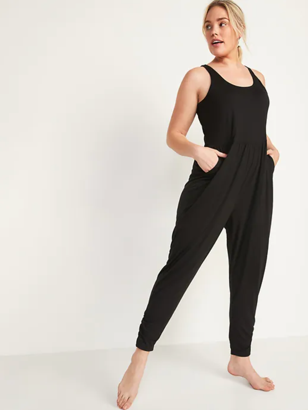 You can lounge or work out in this stretchy jersey jumpsuit that's made with sweat-wicking fabric. It also comes in white and dusty red and in sizes XS to 4XL and in regular, petite, and tall.