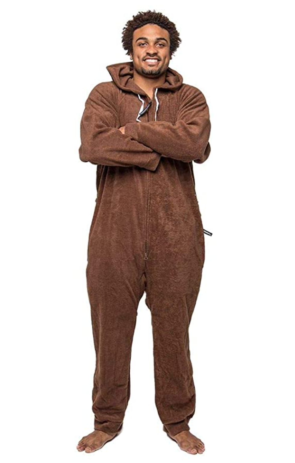 This fleece onesie is the ultimate lazy lounge outfit that comes with detachable socks. It has zippered pockets, a hood and even a butt flap.