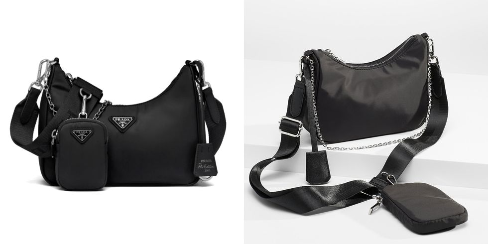 Details: The Prada 2005 Re-Edition 2005 Re-Nylon Bag (left) is a nostalgic design that runs for $1,920 that Canadian retailer Simons created a near-identical dupe of. Steve Madden also makes a similar bag for $73.50 in other colours besides black.