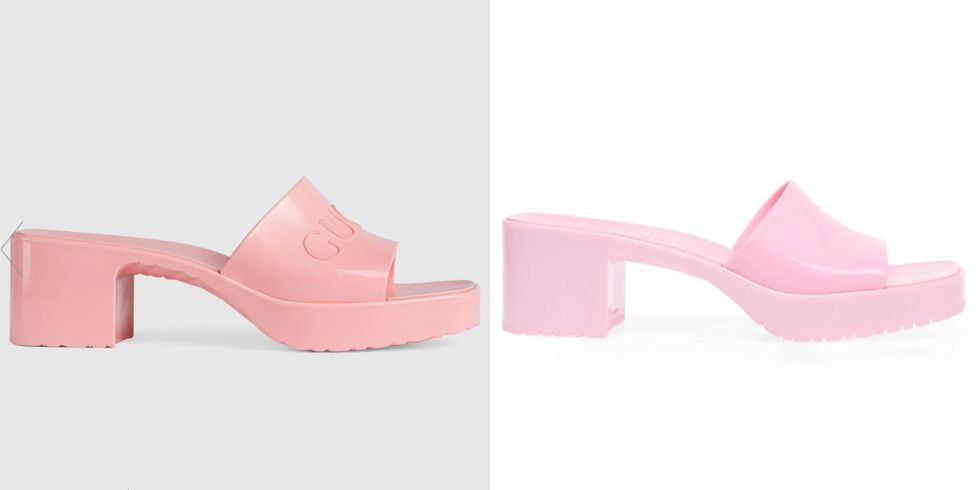 Details: The Gucci Rubber Slide Sandal (left) is the shoe that'll help you channel your inner Polly Pocket, but $455 is a little steep for a sandal you probably won't wear that often. Instead, grab these super similar ones from Steve Madden on days you want to make a bold impression.