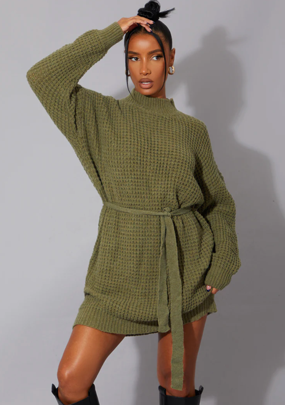 Details: Here's a sweater dress that is meant to be loose-fitted, although you can always style it with a cute belt for a cinched waist. It's available in grey, brown and green in regular, tall and petite sizes XS to 4XL.