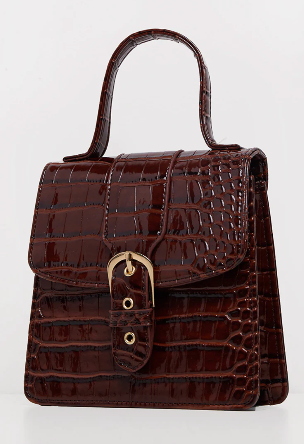 Details: Chocolate brown is the new black. This shiny faux croc bag is modern but gives off a vintage vibe at the same time. It's an eye-catching piece that would look incredible with a monochromatic outfit.