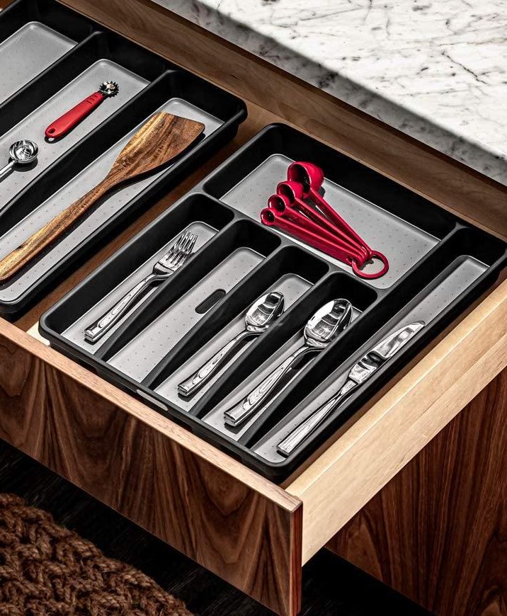 If your cutlery is in disarray, you might want to reorganize your kitchen drawers with the help of a non-slip silverware tray. It has six spacious compartments you can divide your silverware between.