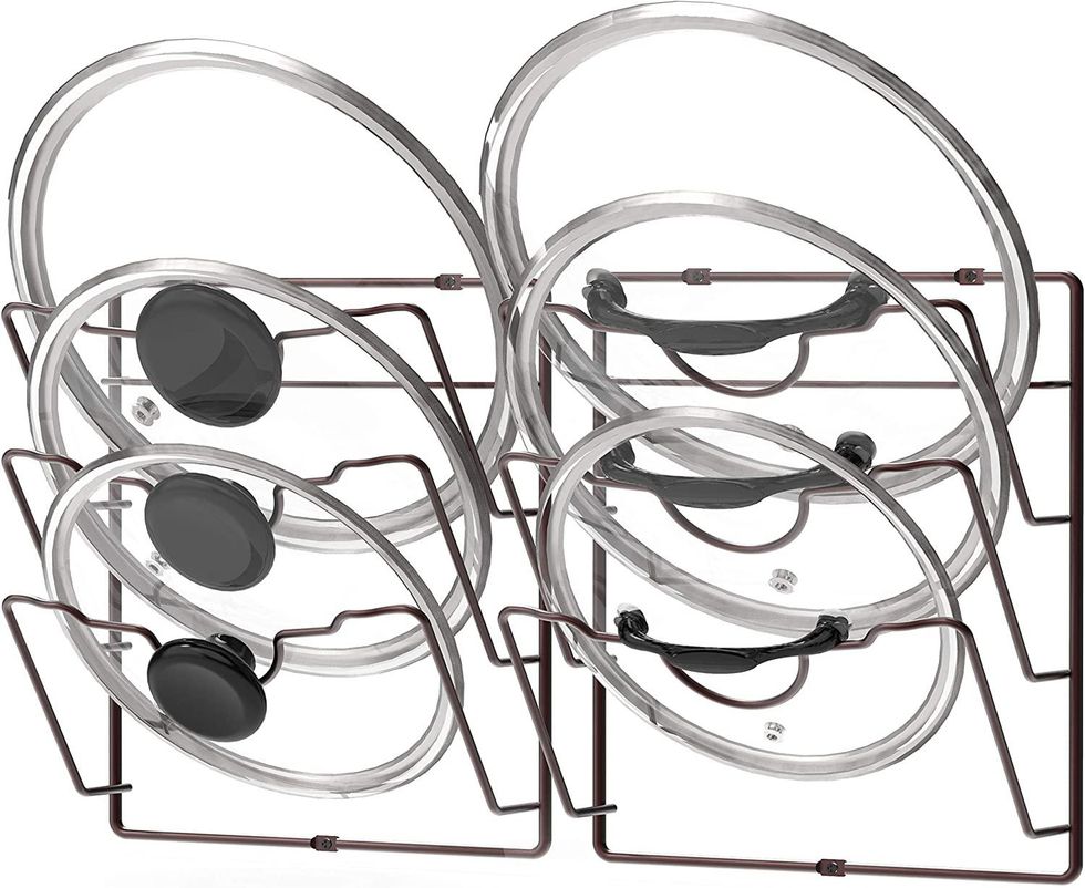 These clever lid storage racks will save you from clanging around in your cupboards every time you need a pot lid. You can mount them directly onto the inside of your cupboard door, which will also free up some space in your cupboard.