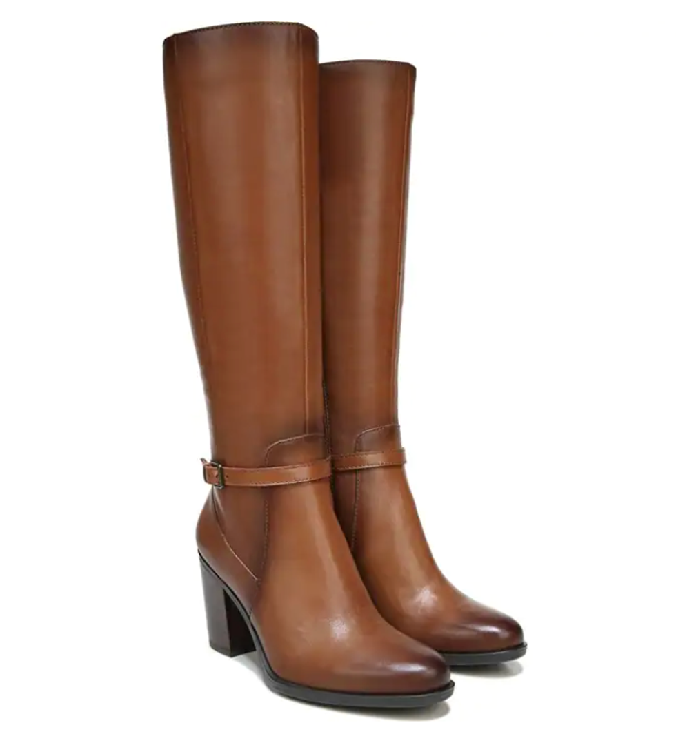 These heeled boots will make your legs look long and lean. They're so versatile that you can wear them from the office to the bar. They're made of leather and you can choose between a medium or wide fit in brown or black.