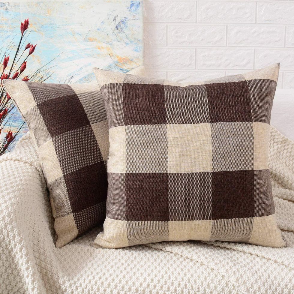 MERNETTE 2-Pack Plaid Linen Decorative Square Throw Pillow Cover