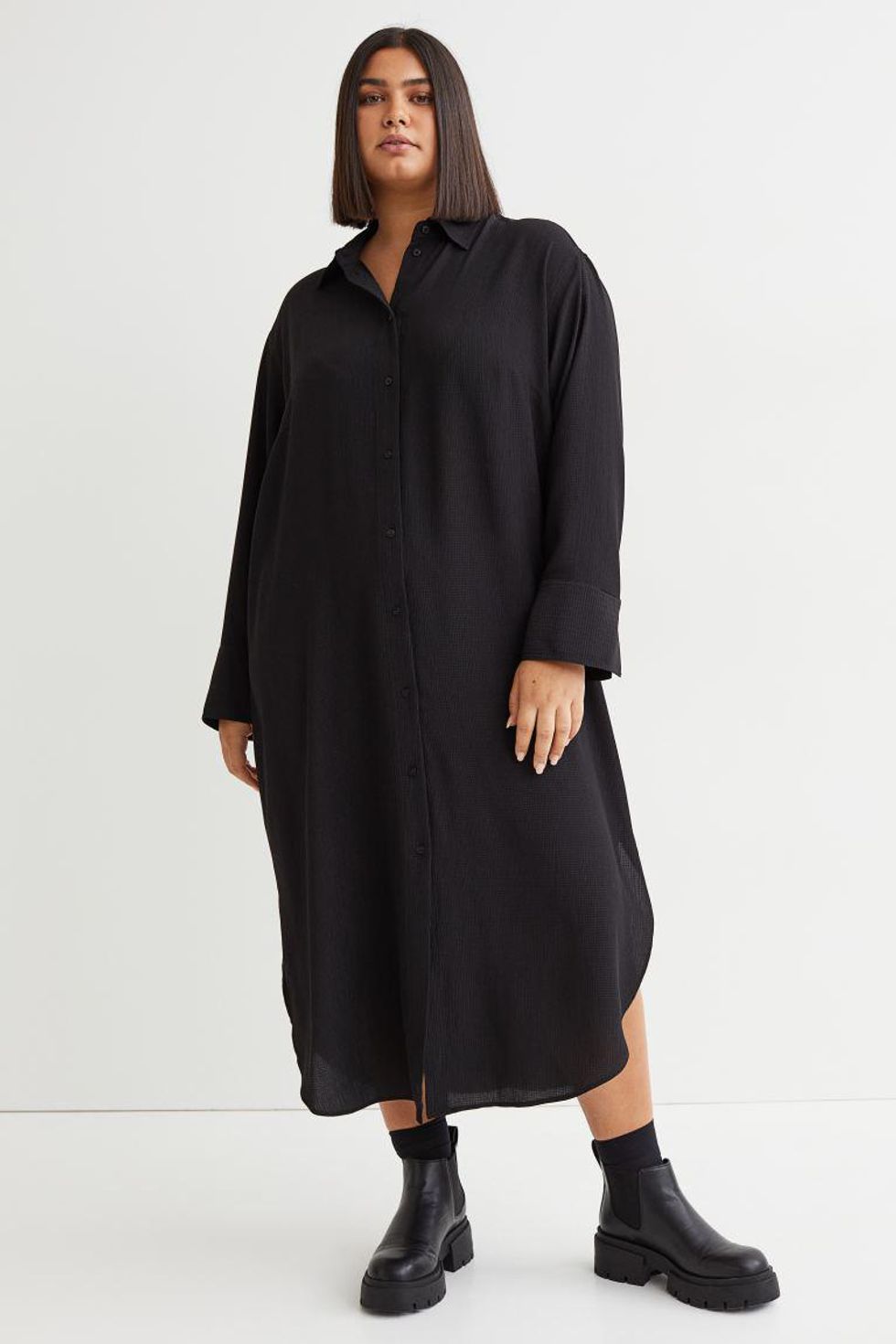 Details: This plus-size shirt dress is long and luxurious and will look chic as heck at your next dinner party. It's available in black, pink or floral print in sizes large to 4XL.