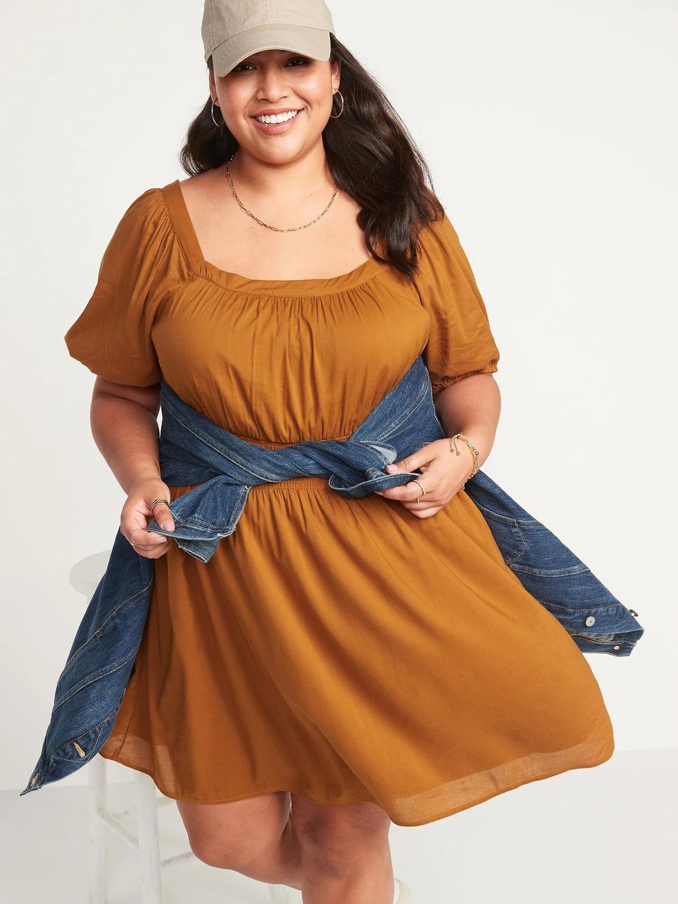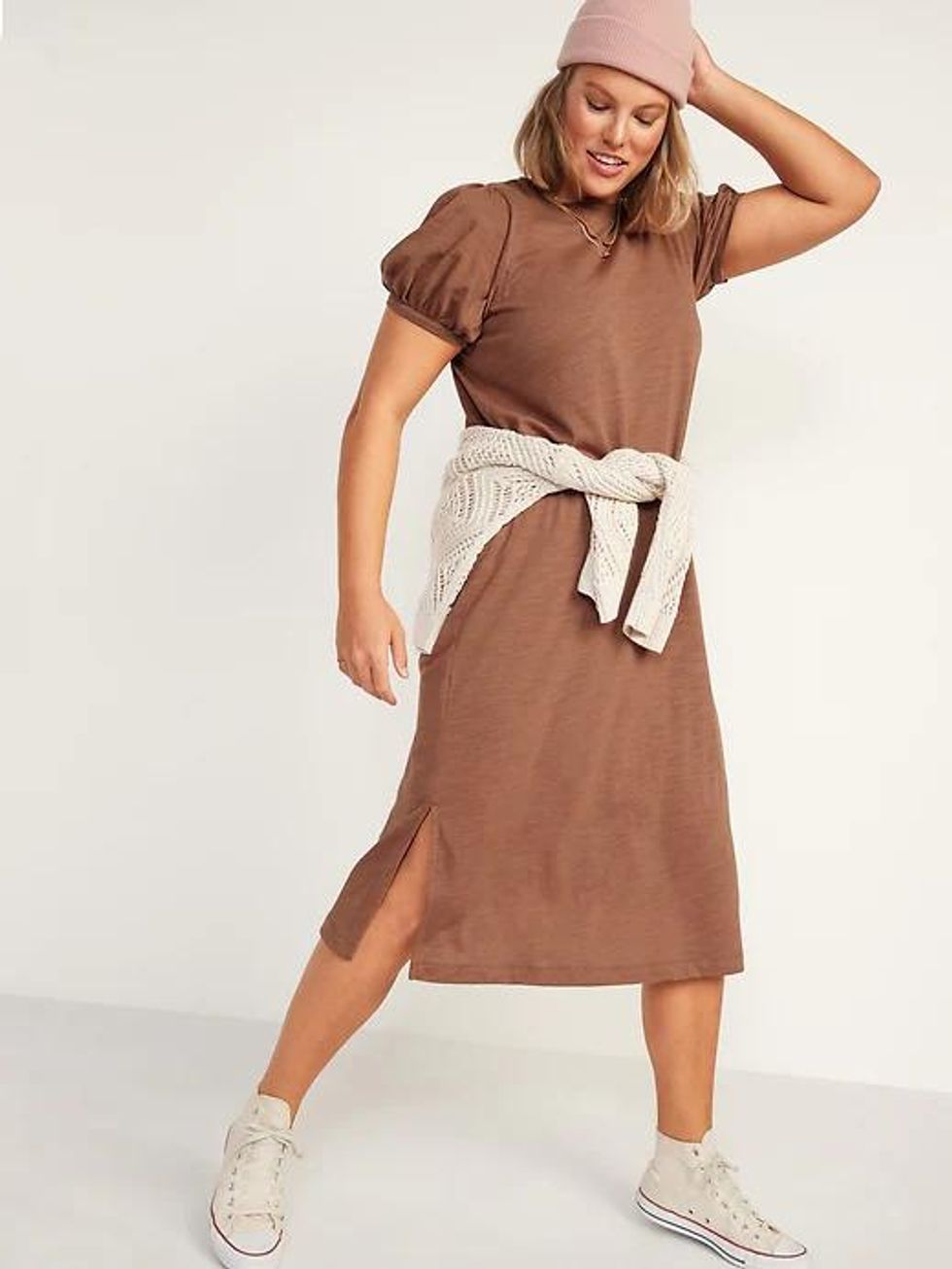 Details: This puff-sleeve dress from Old Navy will look great paired with your favourite fall jacket and a pair of warm tights. It's available in three colours in sizes XS to 4XL in regular, tall and petite.