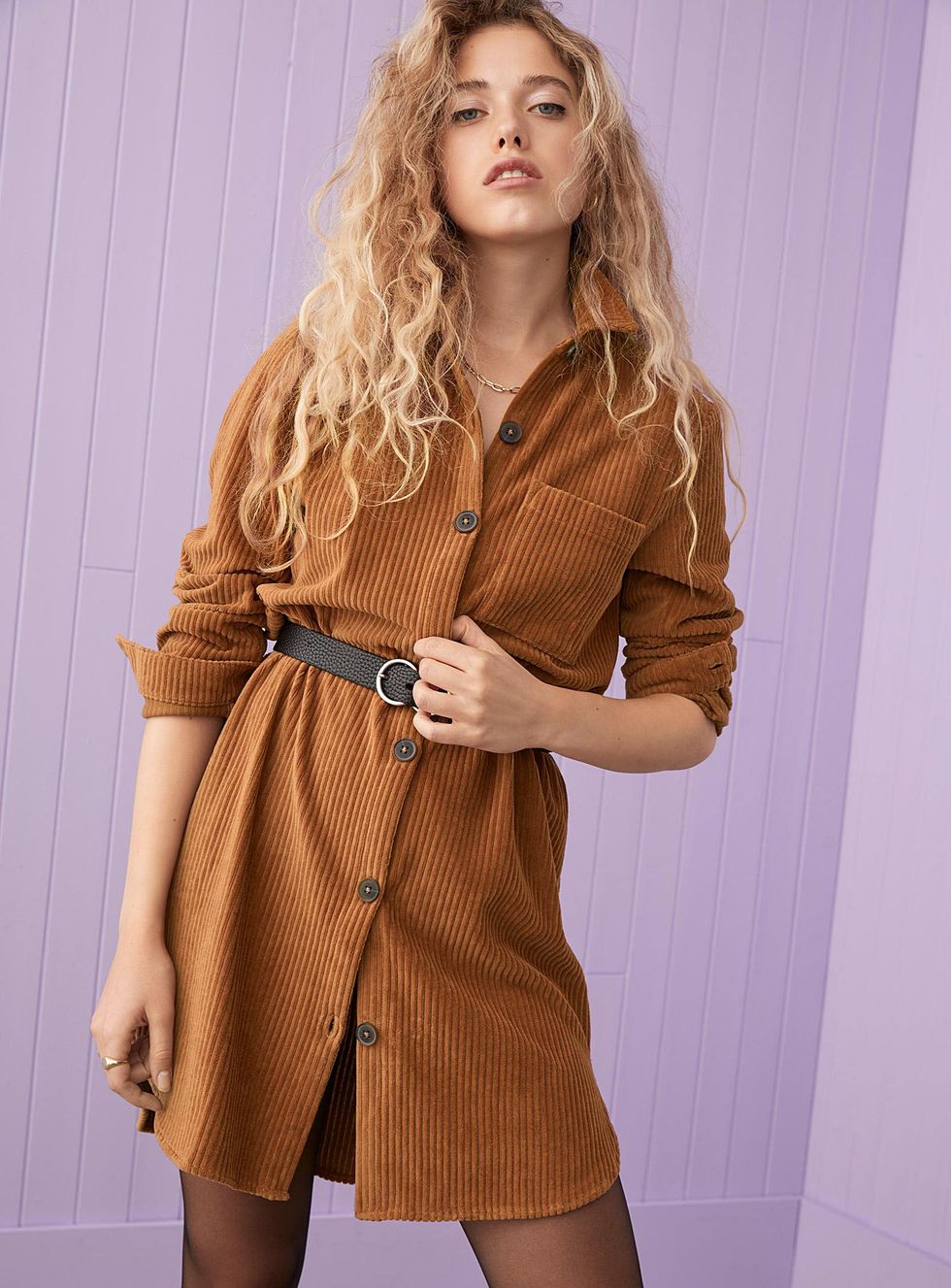 Details: Here's a soft corduroy dress that's meant to be loose fitted, but you can always style it with a cute belt for a cinched waist. It's available in rusty orange, green or mauve in sizes XS to XL.