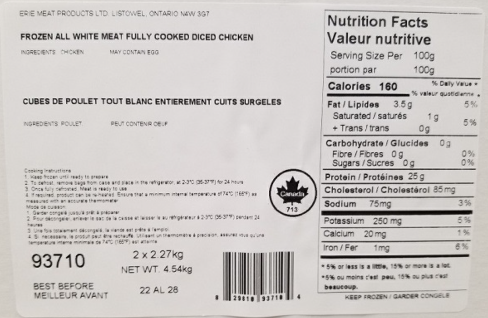 The recall for Erie Meat Products Ltd.'s Frozen All White Meat Fully Cooked Diced Chicken refers to packs with a best before date of April 28, 2022.