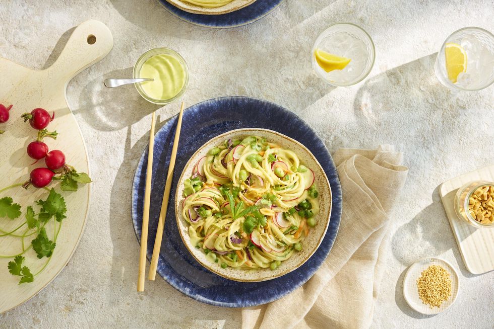 This impressive-looking noodle salad uses a handful of shortcuts on its way to becoming such a showstopping dish. The first is store-bought coleslaw mix, and the second is Hellmann’s Vegan Green Goddess Salad Dressing.