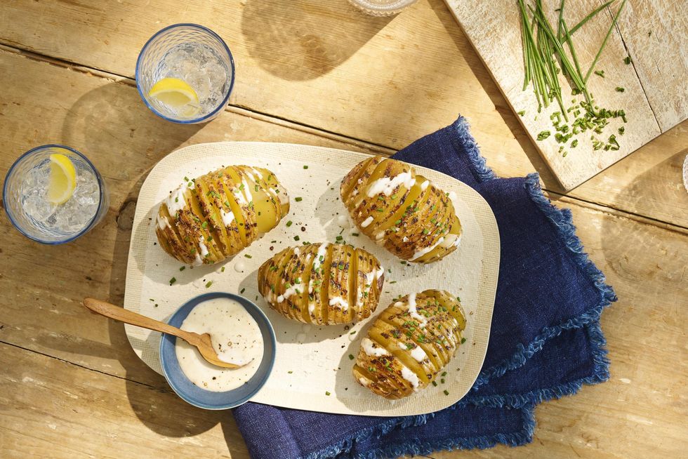 There’s nothing quite like taking a bite out of a crispy golden Hasselback potato, except when it’s drizzled with a generous amount of Hellman’s Vegan Caesar Salad Dressing.