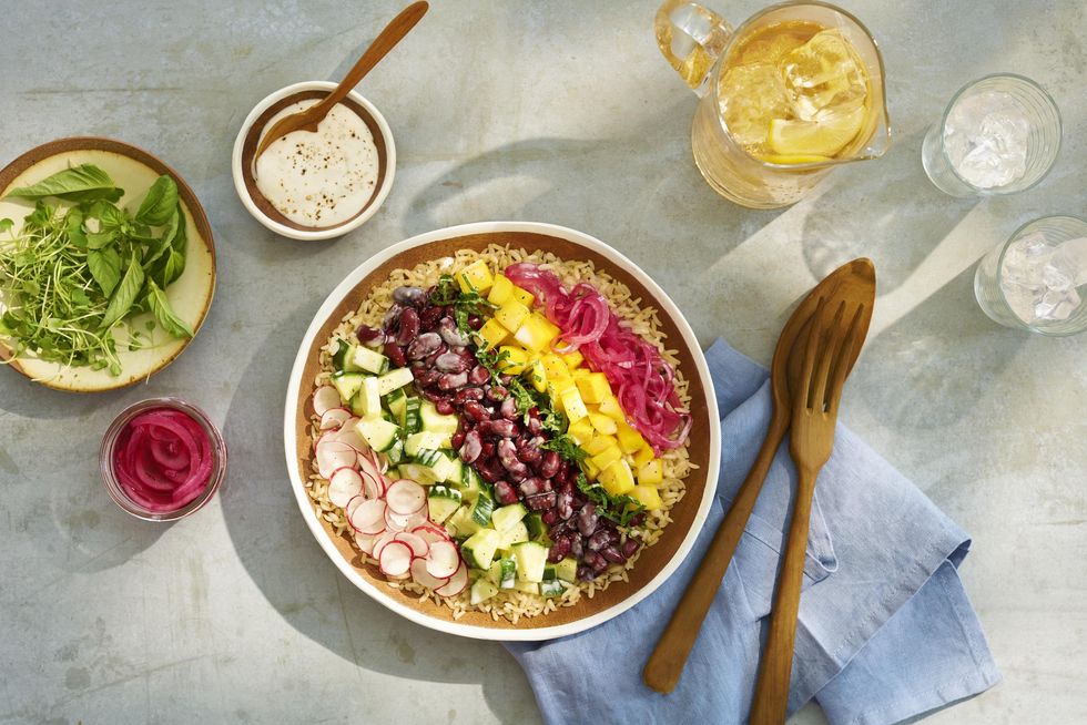 Made with beans, veggies, fruit, pickled red onion and fresh basil, this bountiful bowl is a rainbow for the palate as well as the eye.