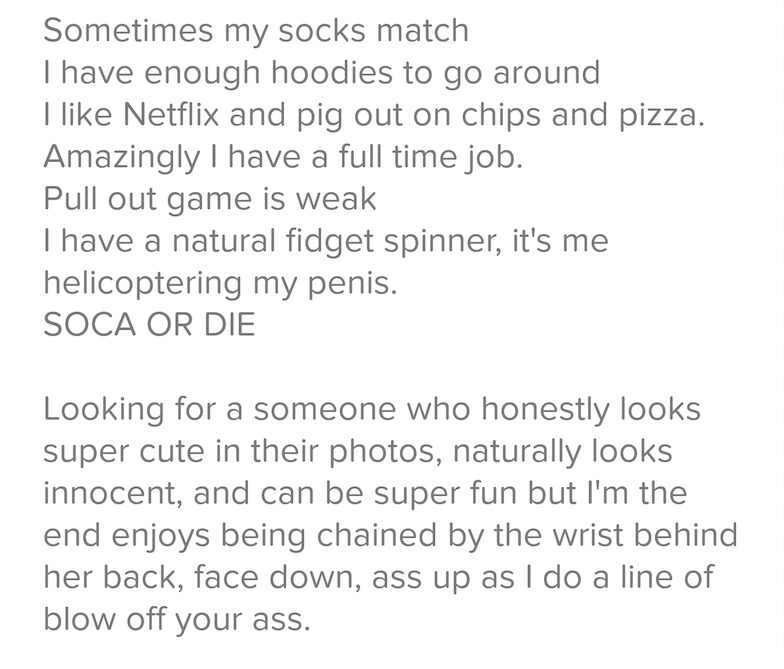 If you have to specify those things in a dating app, I have a feeling at least one out of three of those boasts might not be entirely true.
