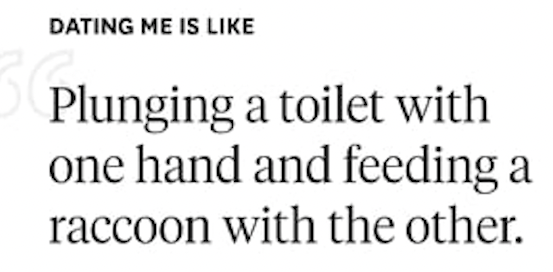 "Dating me is like plunging a toilet with one hand and feeding a raccoon with the other."