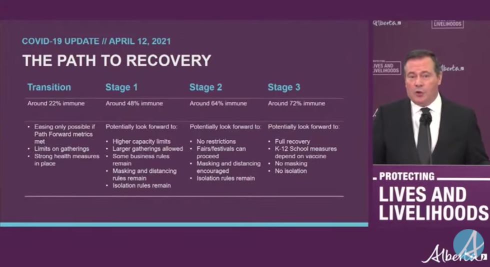 By mid-September, pending vaccine supply, the premier hopes we can move into Stage 3 which would mean a full recovery with no masks. The only thing that may remain at this point would be school-based measures if vaccine supply hasn't reached Alberta's youth population yet.