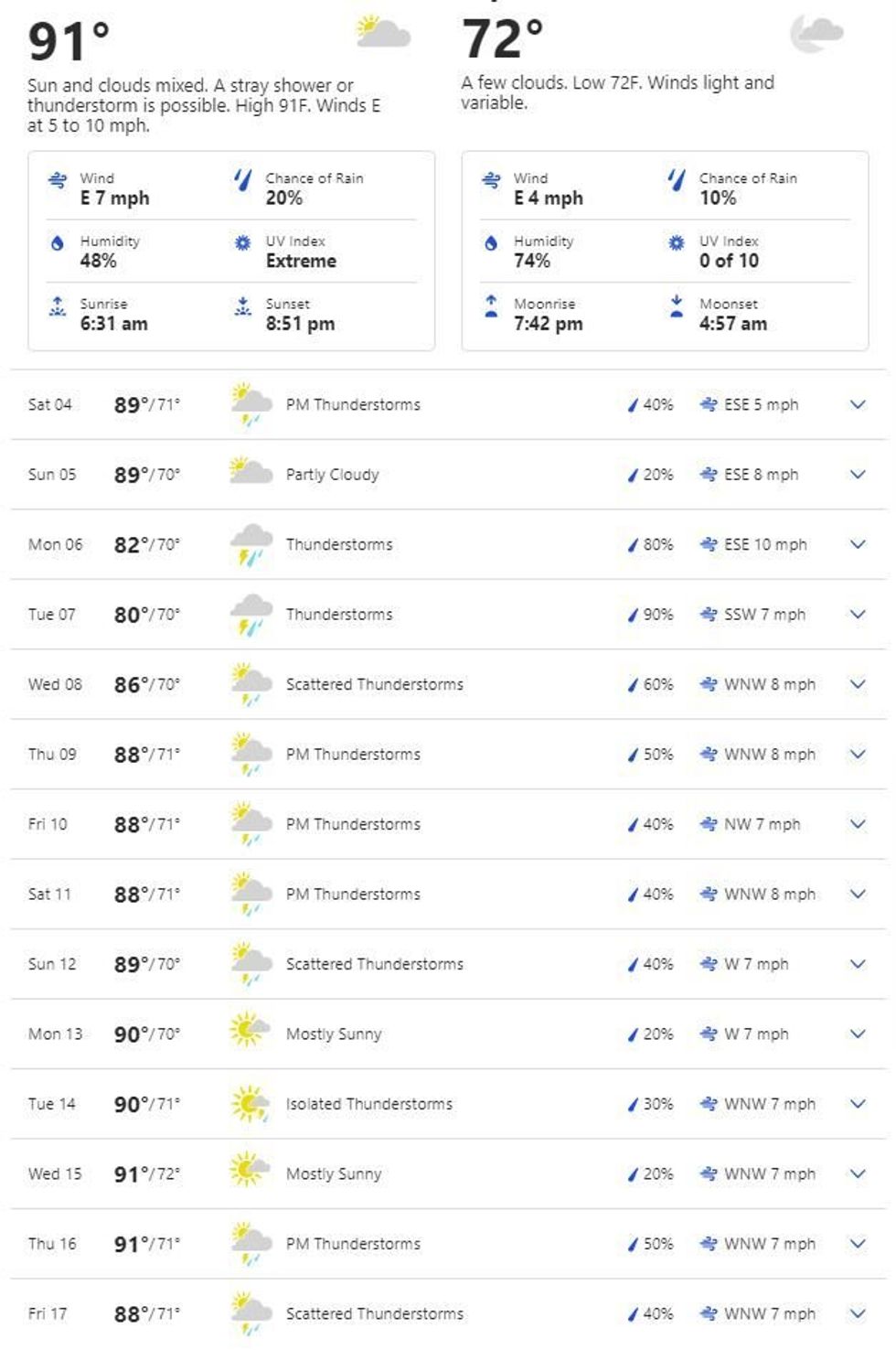 The Weather Channel predicts a 30 to 80% chance of thunderstorms every single day, with humidity levels ranging between 74 and 94%, keeping that air hot and sticky. Time to break out those shorts and tanks if you haven't already!
