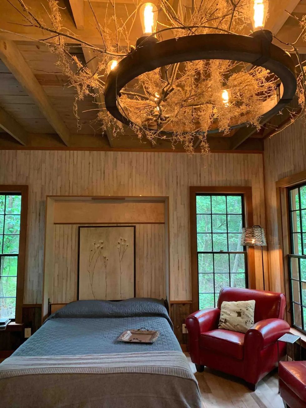 The entire interior is made out of wood with maple, Sapele, ambrosia, Shady Dale pine, hickory, 100-year-old Barnwood, bocote, a cherry desk, cedar bath and even a splash of rosewood burl, according to the property's description.