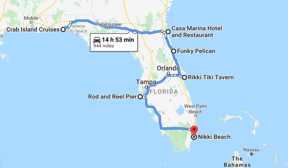 This epic trip across the Sunshine State is about 945 miles and 15 driving hours total. You should plan to spend about a week traveling from one tasty spot to another. Bring your best friends and, of course, your appetite!