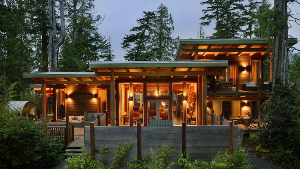 Why You Need To Go: This waterfront house is located in a coastal forest on an inlet and is completely private. It has 16-foot ceilings inside plus ocean views from every room. Outside there's a deck, a BBQ, a fire pit and a hot tub with an ocean view.