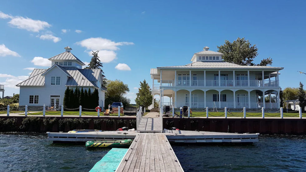 Why You Need To Go: This private gated cottage overlooks Lake Huron and sleeps up to 12 guests with a lakeside cabana and private guest suite. Outside, the home is surrounded by water on three sides with a big lawn and a dock.