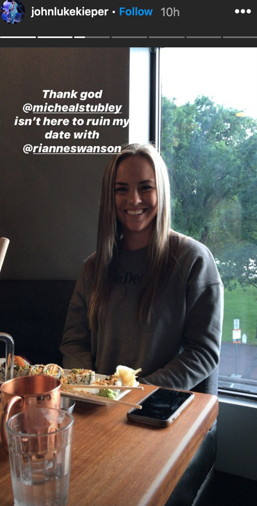 On his profile, the 23-year-old posted a photo of Swanson and wrote, "Thank god @michealstubley isn't here to ruin my date."