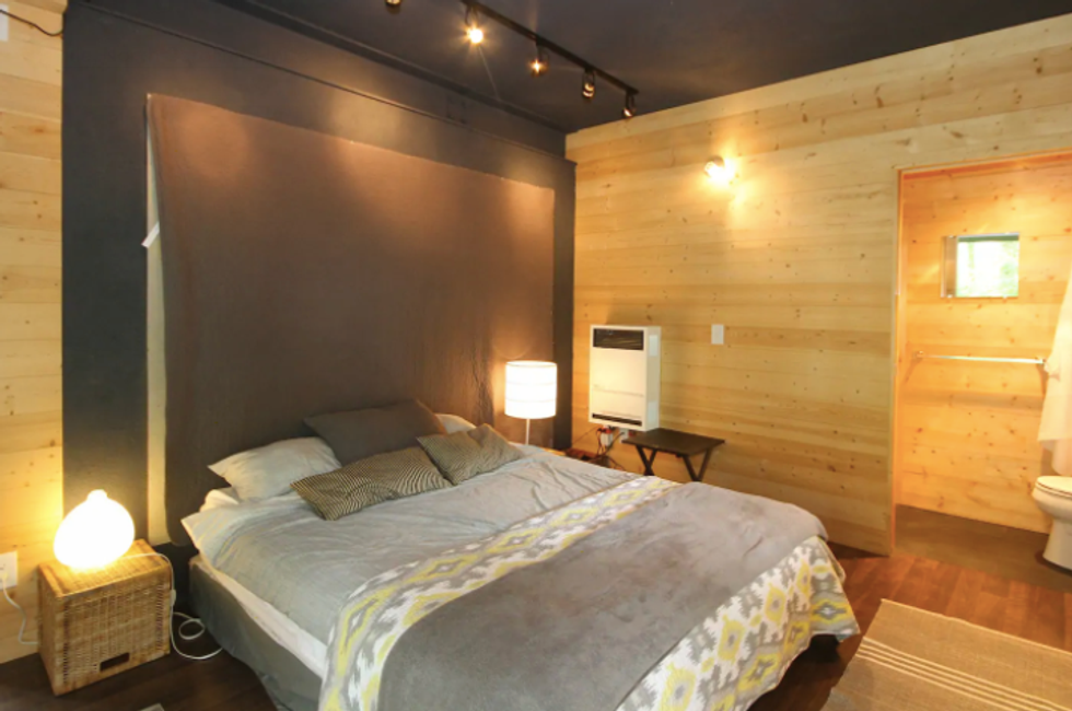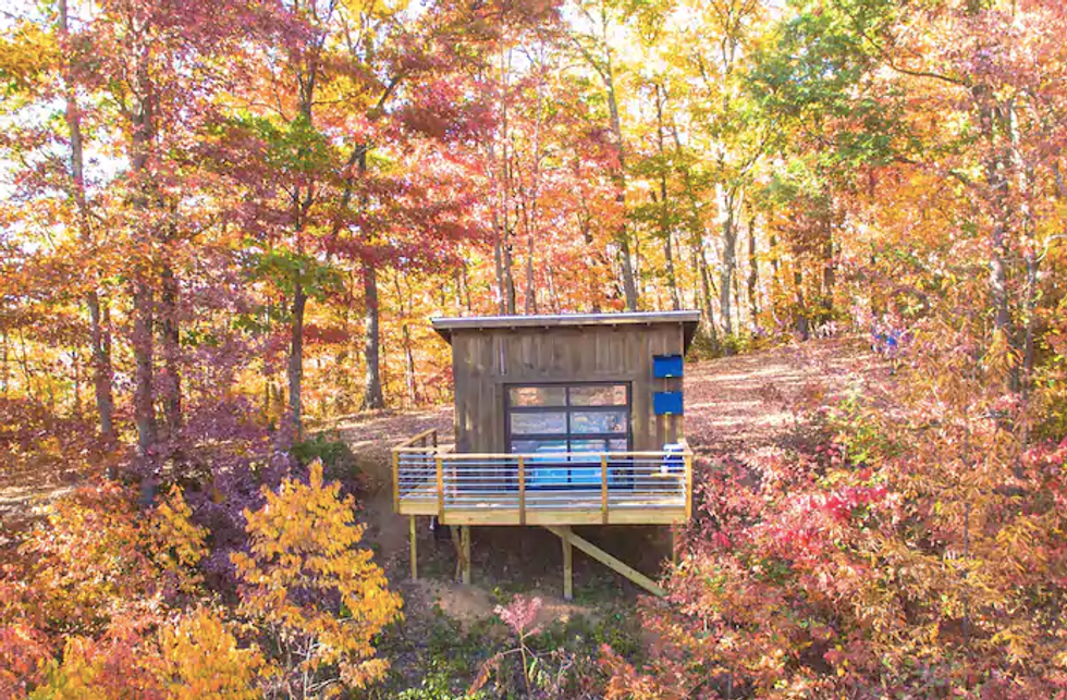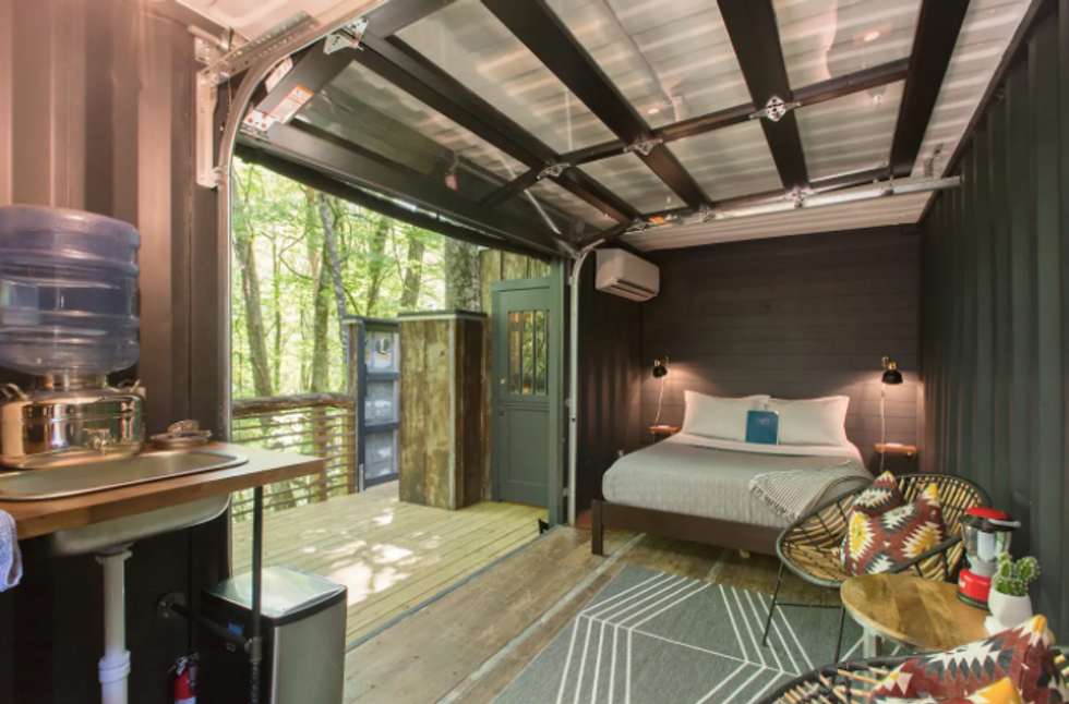 Why You Need To Go: This shipping container cabin sits on 125-acres and will give you the feel of going off the grid. There's a huge glass garage door you can open during the day for fresh air while you relax on the queen-sized bed.