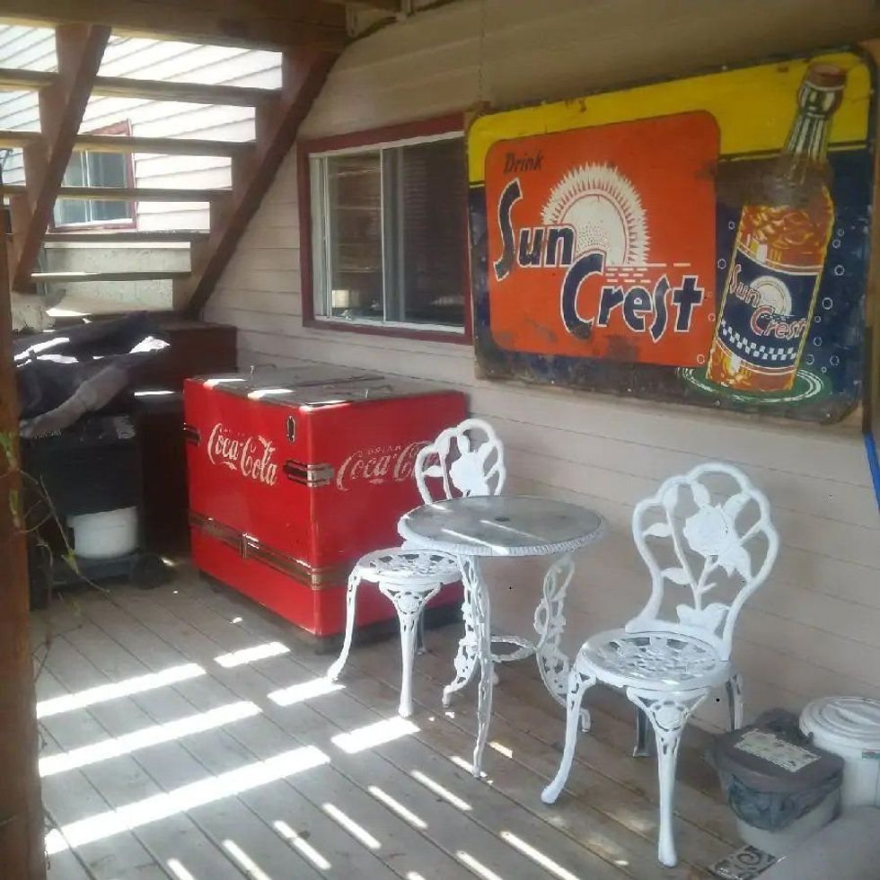 Outside you'll also find a charming small patio filled with antique coolers and signs.