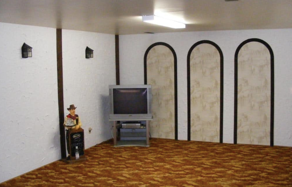 Equipped with shag rugs, unique wall paper, and a wood bar, this place screams 70s house party.