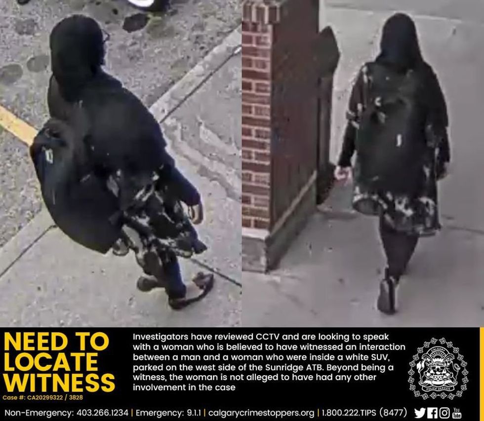 After reviewing CCTV footage, police are now looking to speak with a woman who is believed to have witnessed a “disturbance” between a man and a woman who were inside an SUV parked on the west side of the Sunridge ATB.