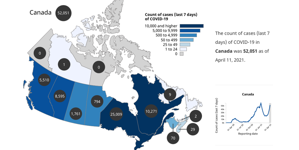 Current numbers show data up to April 11 and including the seven days prior. It shows that most of the country's cases and deaths were reported in Ontario and Quebec last week.