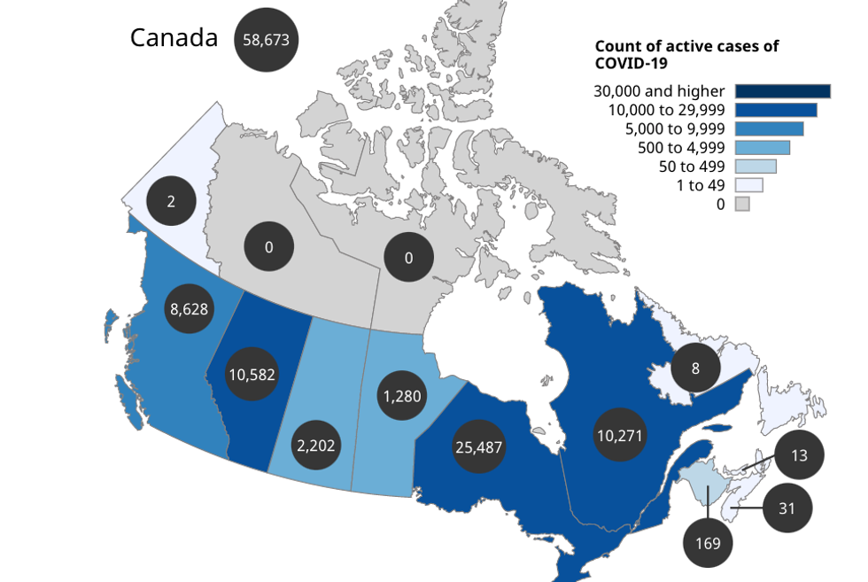 Right next door, Yukon only has two cases. Meanwhile, Ontario is leading the country in active cases with a whopping 25,487.