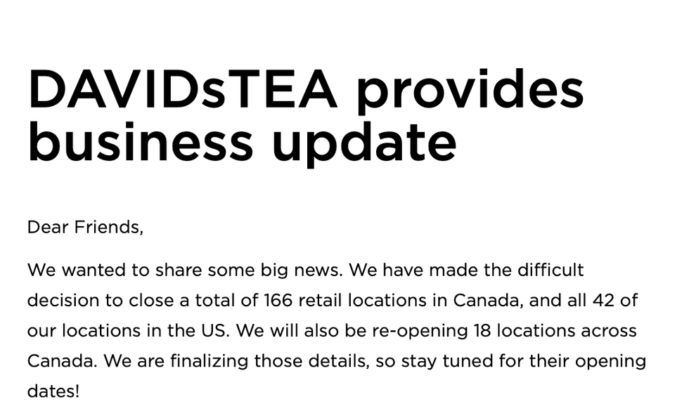 After originally shutting down 82 locations in just 30 days last year, David’s Tea recently confirmed online that it would be closing “a total of 166 retail locations in Canada, and all 42 of [its] locations in the US.”