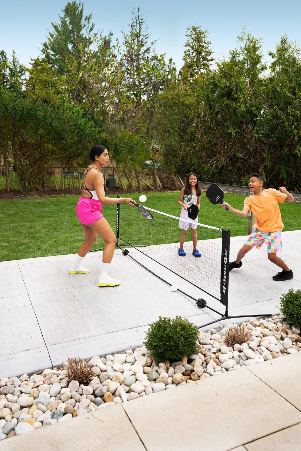If there aren't any dedicated pickleball courts nearby, you can play on a badminton court (they're the same size). Or, if you have a net like this, you can easily set up a game in your driveway.