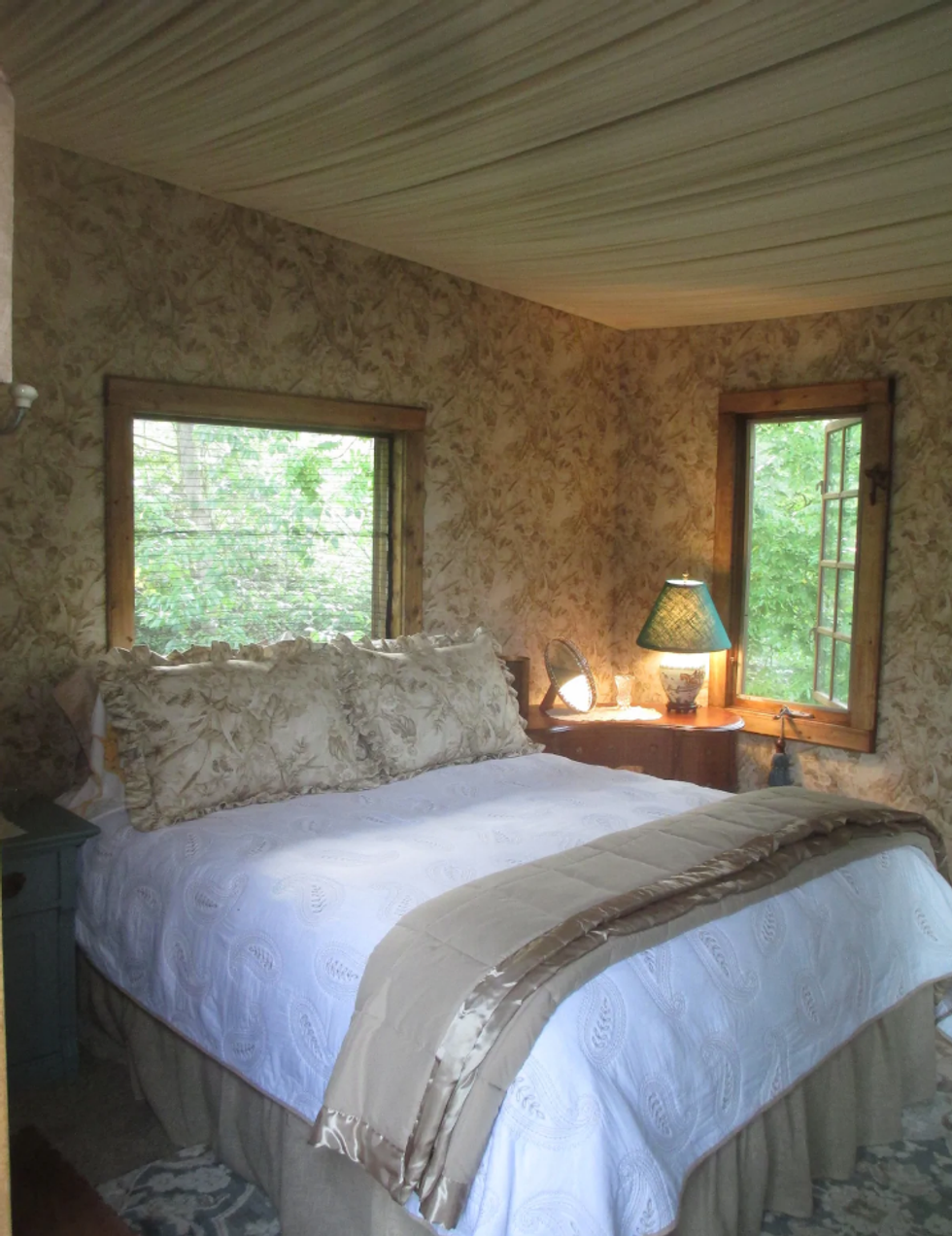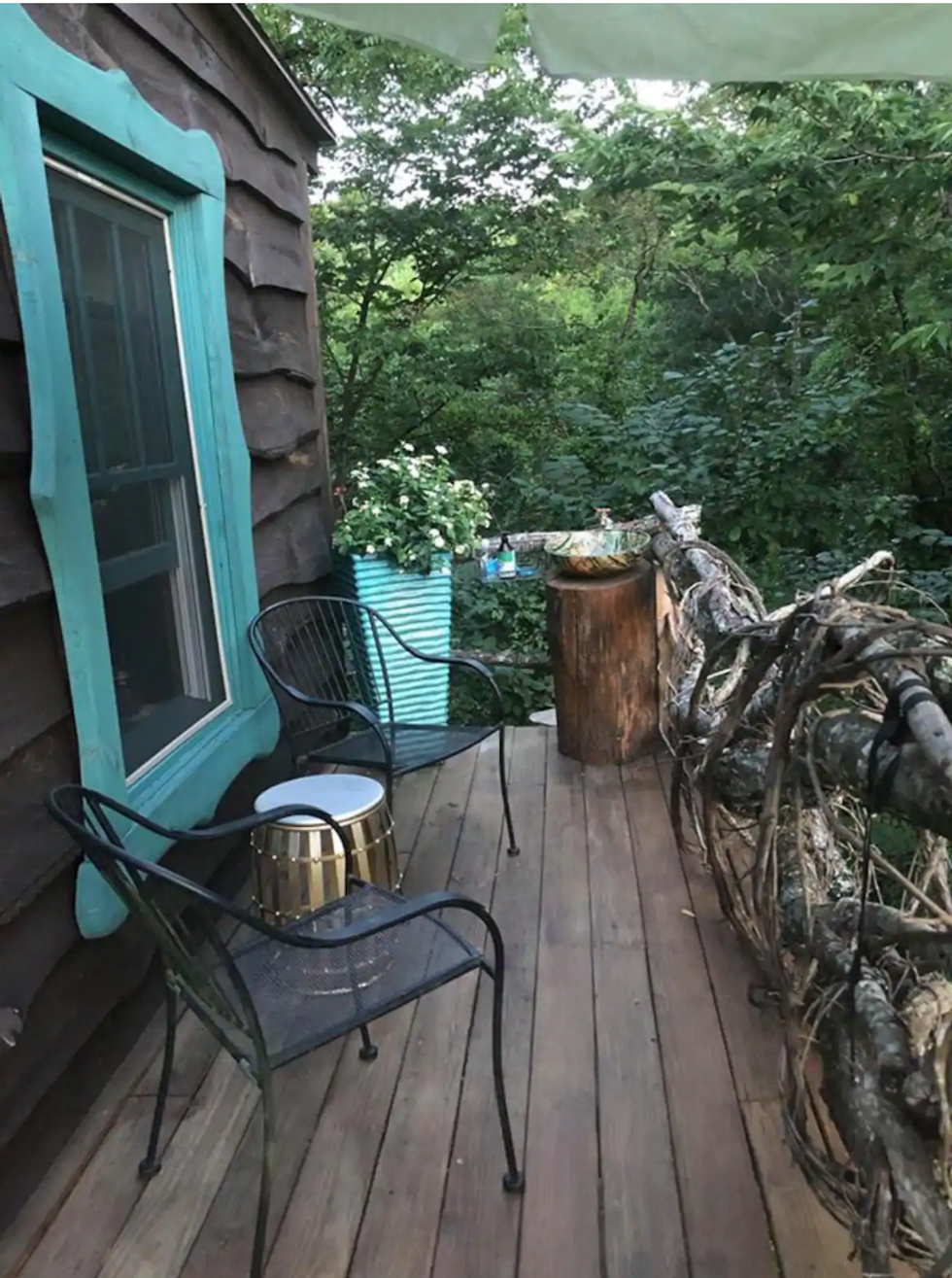 The doorway leading to the bedroom in the Dragon's Knoll Airbnb. Right: The couch inside the common area.