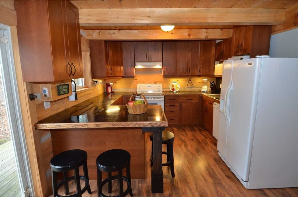 As with most cottages on the water, this spot’s biggest highlight is its location. The three-bedroom and one-bathroom log cabin puts you super close to the beach.