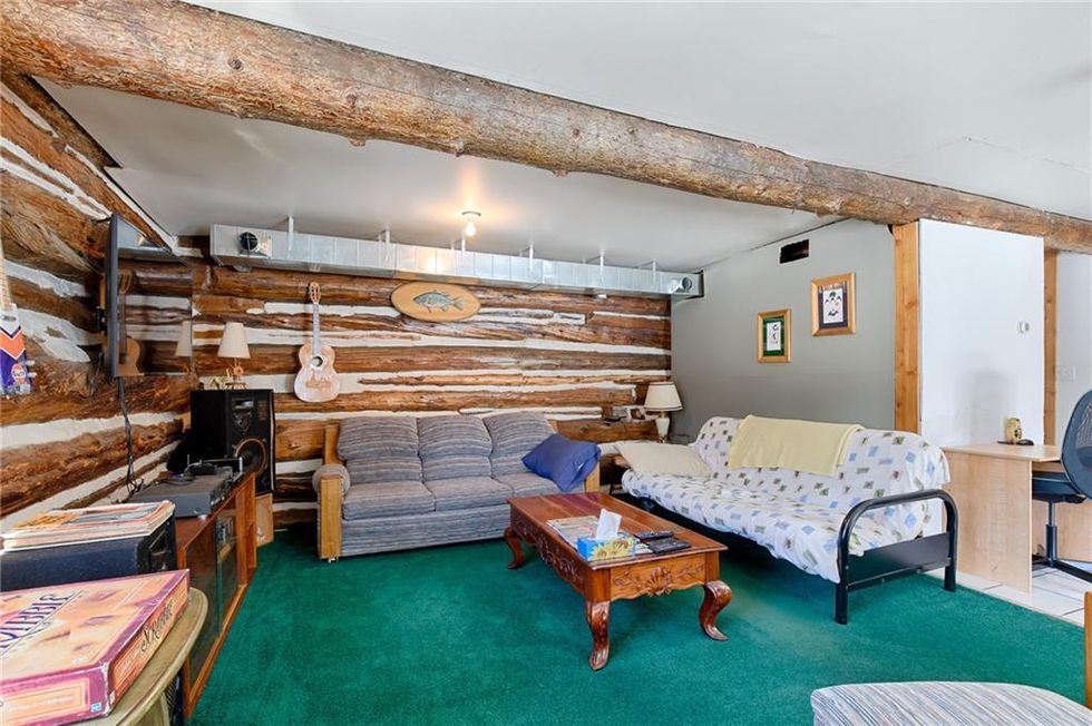 The exposed log walls and wood fireplace all add to the rustic charm of the place.