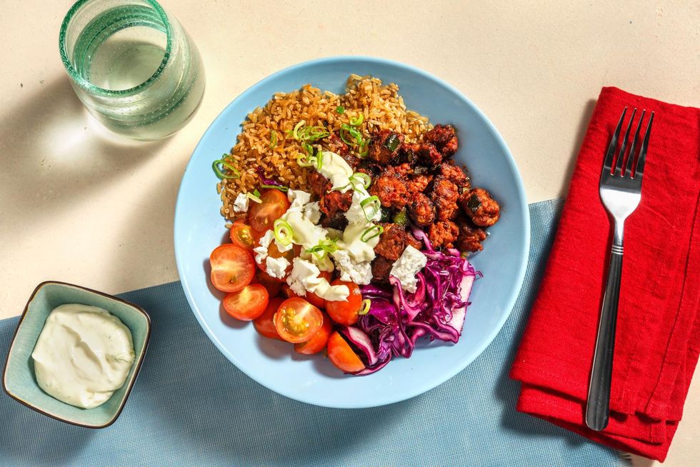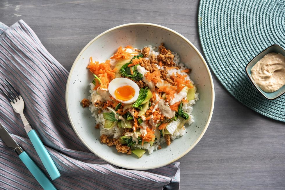 This Japanese-style rice bowl will make your mouth water. Seasoned Meatless Farm patties pair perfectly with sautéed bok choy and grated carrots — and it all sits atop a bed of warm sushi rice. A runny boiled egg and a drizzle of homemade spicy mayo finish off this delectable dish. It's like a warm hug in a bowl and takes just half an hour to make.