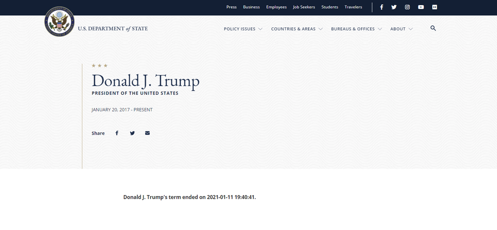 Donald Trump's biography page on the official U.S. Department of State website, which normally doesn't exist, now says his term has ended, just a little over a week before Joe Biden is set to take over the White House.