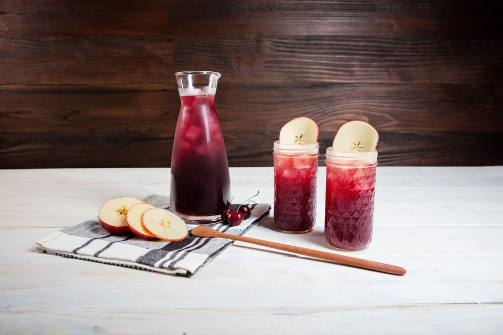 Add pear and apple slices, orange wheels and some seasonal fruit to a pitcher. Mix away, pour over ice, garnish as you wish and enjoy! This recipe serves 10 and can be made the day before so you can spend more time with your guests.