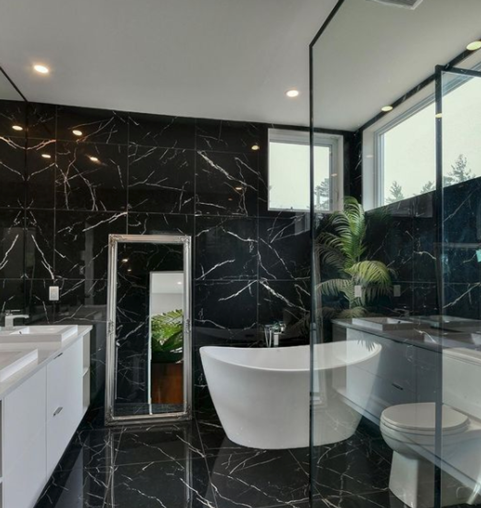 One of the bathrooms is covered floor-to-ceiling in black marble. If you're a fan of soaking in the tub, this bathtub is an absolute vibe.