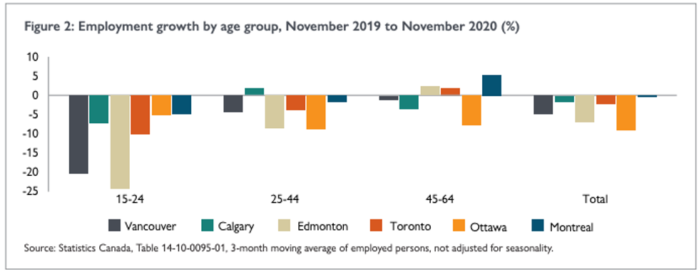 New data shows how Canada's job loss in 2020 has impacted different age groups in the biggest cities.