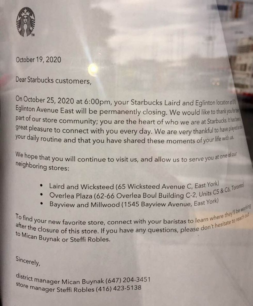 However, Toronto resident Wilmar Kortleever shared a photo of a notice in the Leaside Community Facebook forum that the Starbucks at Laird Drive and Eglinton Avenue East was permanently closing on October 25.