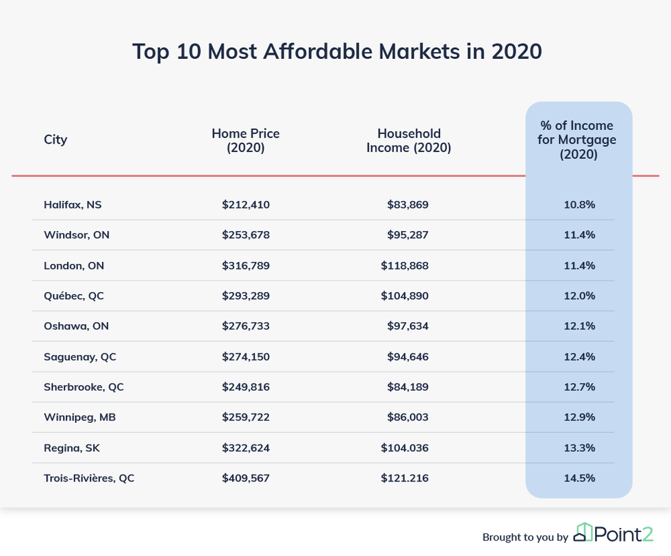 A report by Point2Homes ranked Halifax, Nova Scotia in first place, followed by Windsor, London, and Oshawa in second, third, and fifth place, respectively.