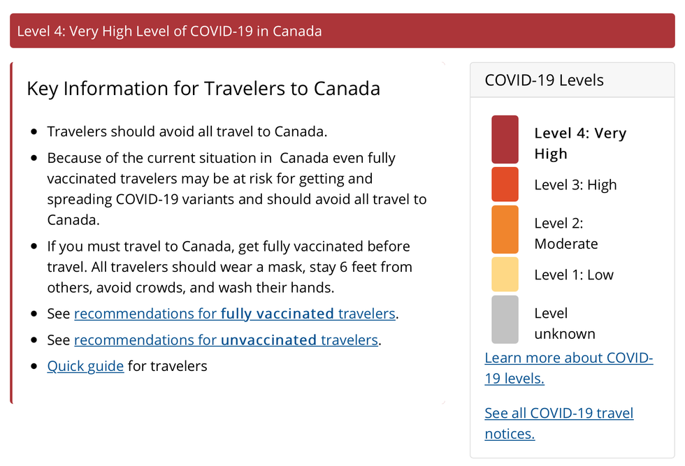"Travelers should avoid all travel to Canada," reads the CDC’s advice, noting that the current situation puts "even fully vaccinated travelers" at risk of getting and spreading COVID-19 virus variants.
