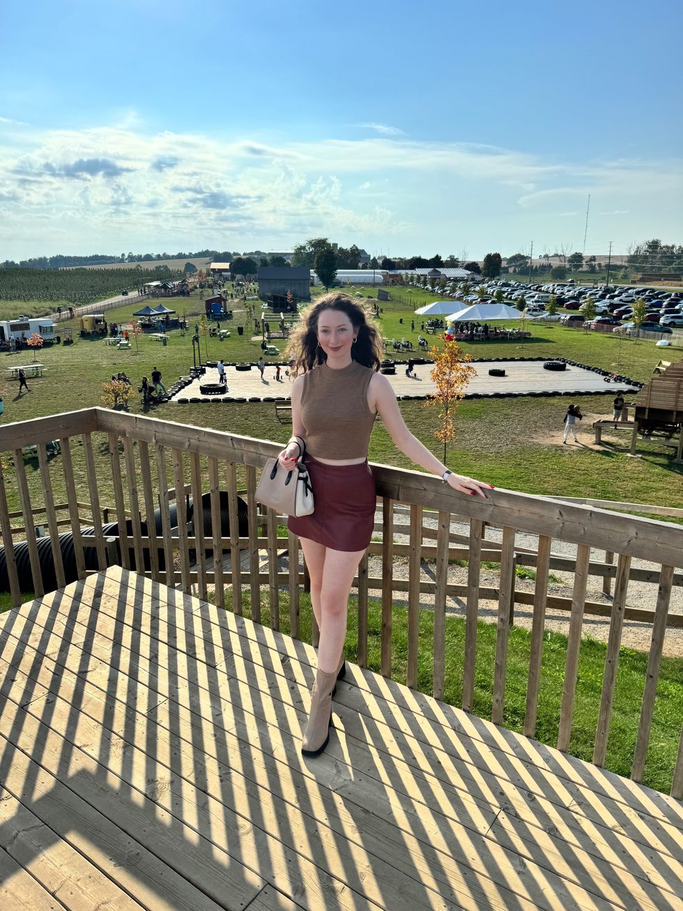 Madeline at a harvest festival. Right: Madeline holding a drink.