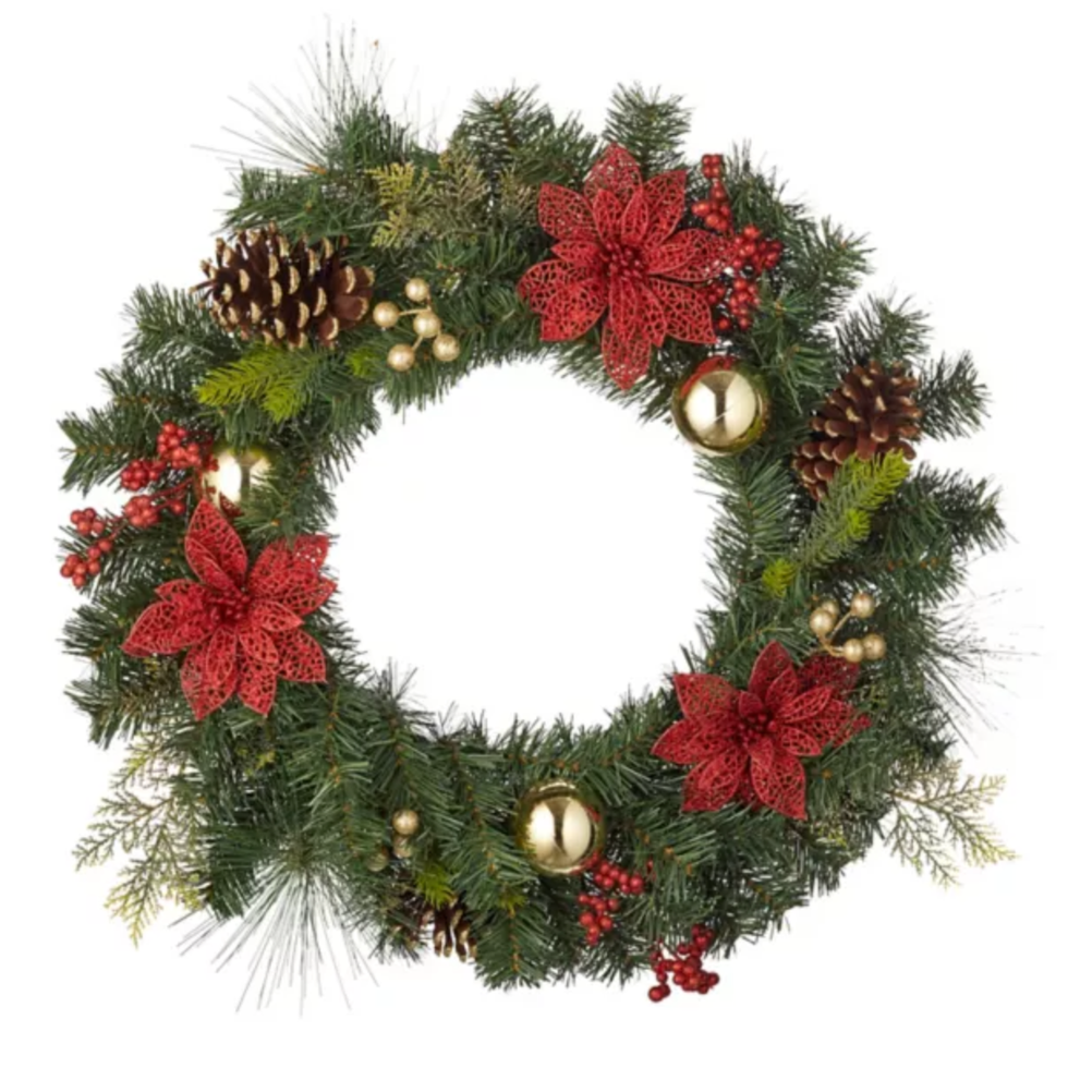 Details: You can hang a wreath from your door to spread the holiday cheer this year. This one has pops of gold and red, making it more eye-catching than just a plain ol' wreath.